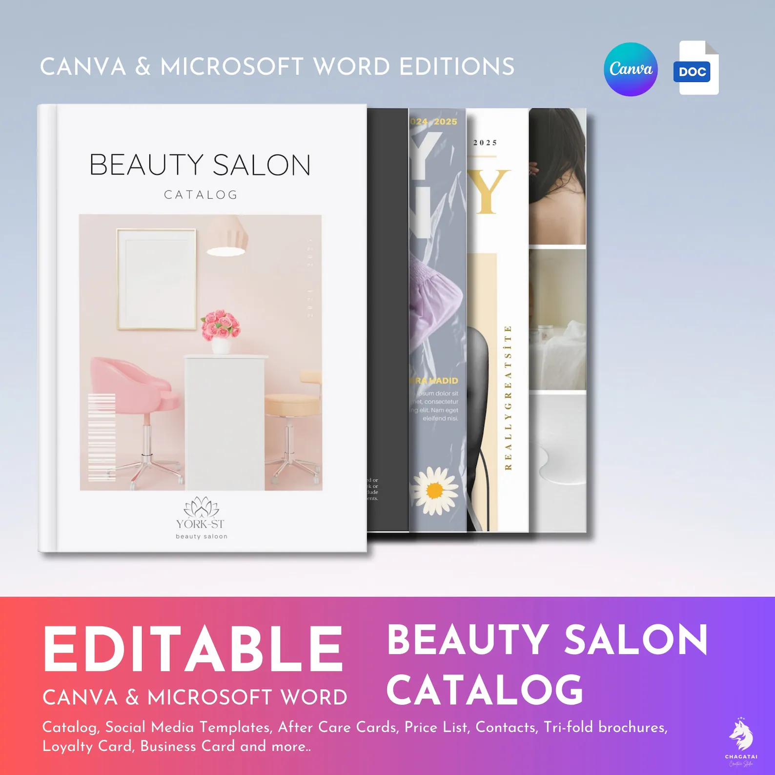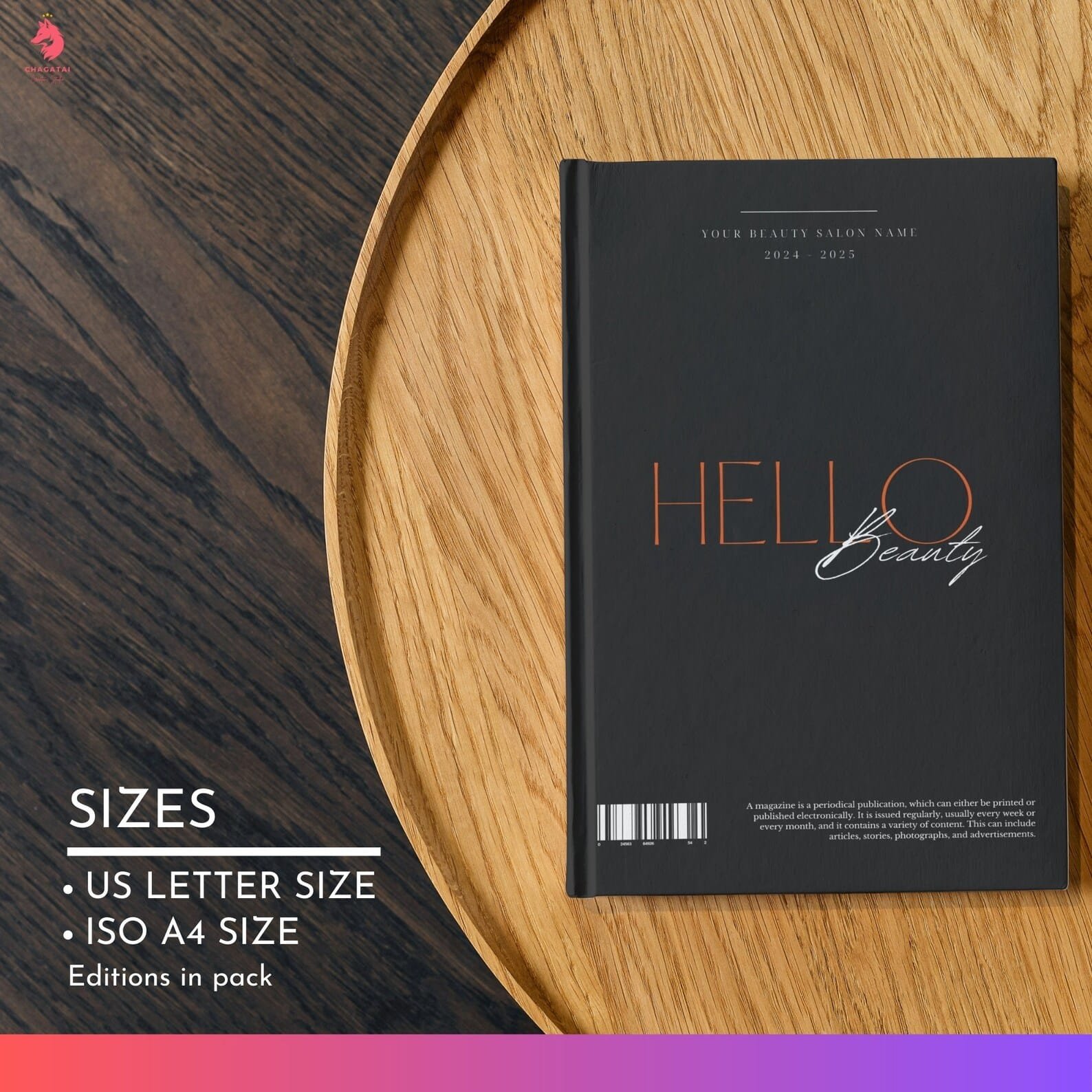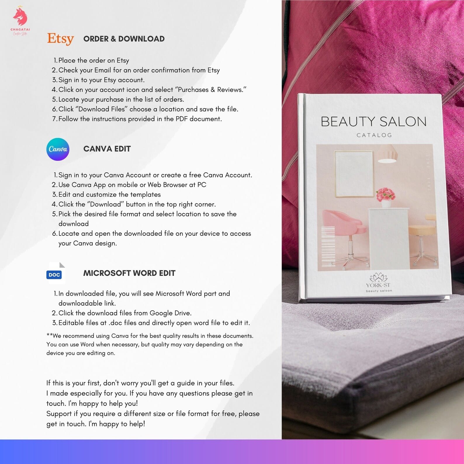 Create a stunning, personalized beauty salon catalog with our Editable Beauty Salon Catalog Template! This versatile template is perfect for estheticians and beauty salons, editable with both Canva and Microsoft Word. Easily customize colors, logos, pages, and more to reflect your unique services. The digital product includes links to Canva and Word templates, available in ISO A4 and US Letter sizes, with five different cover options. Showcase your skincare, makeup, hair care, and nail services with a professional touch. Make your salon stand out with this luxury salon service catalog.🌸🌸